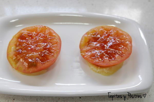 Cortamos los tomates en rodajas no muy gruesas y los sazonamos.