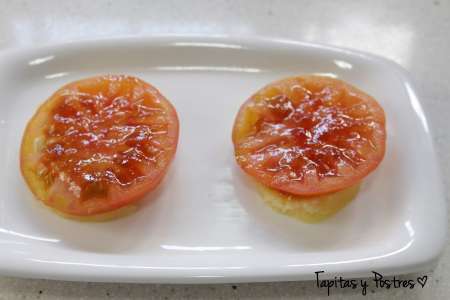Rodaja de tomate y más mermelada de cebolla. Así hasta tener una milhojas de tres capas.
