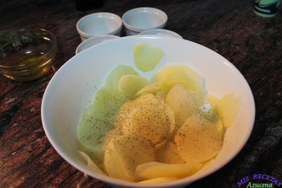 Pelaremos las patatas y con ayuda de una mandolina las haremos rodajas lo más fina posible, una vez tengas todas las patatas listas las pondremos en un bol con aguda para que se pongan un poco duras y quitarle el almidón, reservamos.