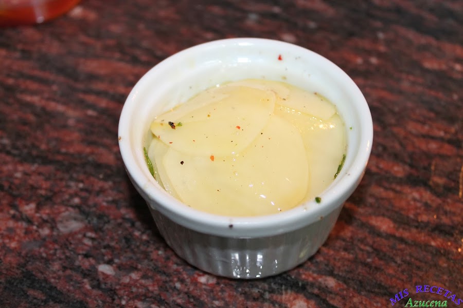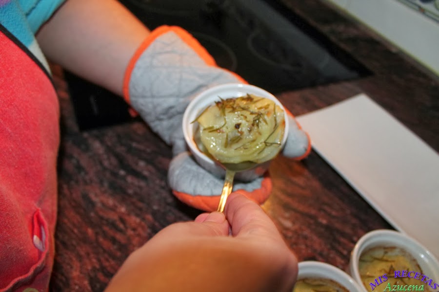 Para esta receta necesitaremos unos tarros de cerámica aptos para horno, yo he utilizado unos ramenquines de 7x5, ponemos el horno a precalentar a una temperatura de 180º.