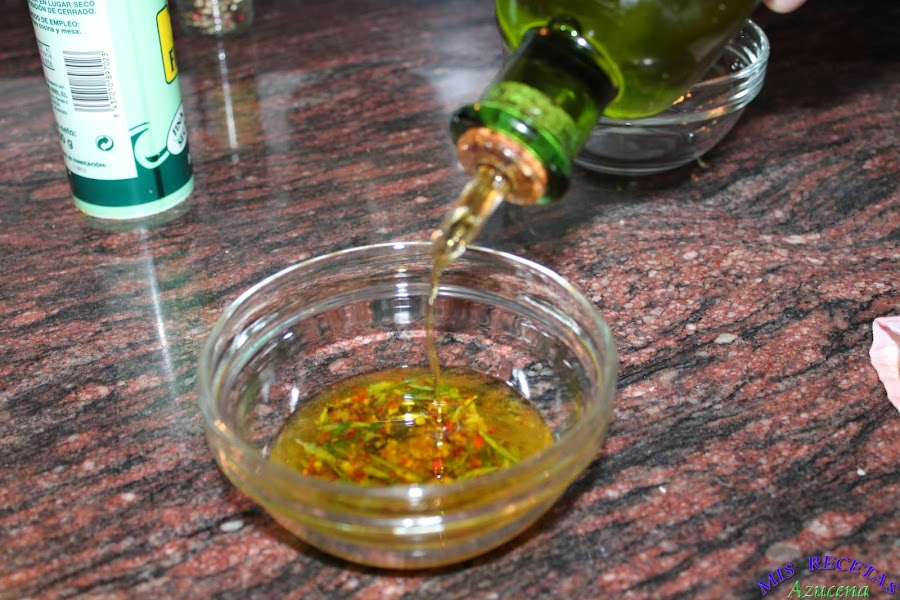 Ahora pasamos todo a un cuenco pequeño y lo completamos con aceite hasta que creas que vas a utilizar, con ayuda de una cuchara mezclaremos el aceite que acabamos de añadir con el majado.