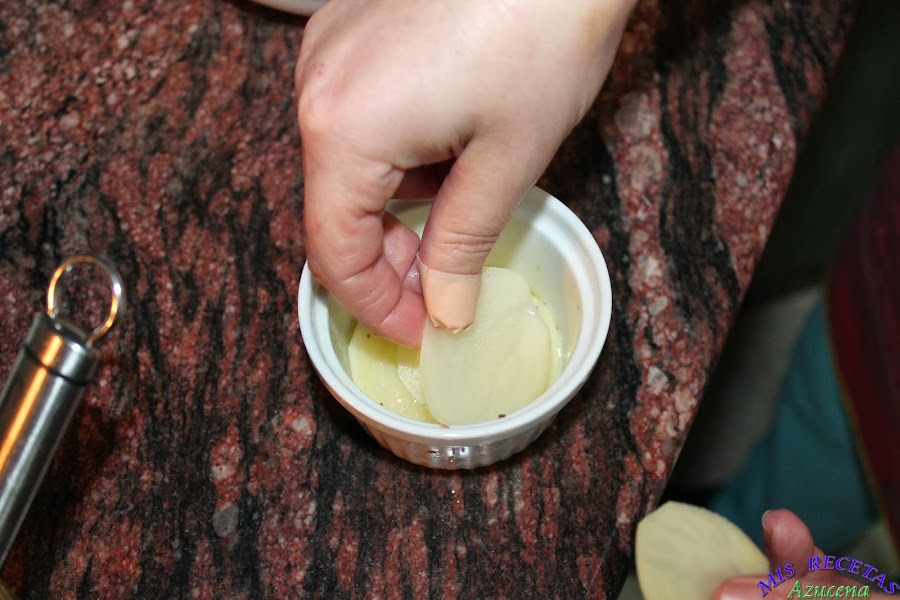 Cogemos las patatas le quitamos el agua, salpimentamos e iremos cogiendo de una en una para ponerla en el tarro que acabamos de preparar, las iremos colocando en el molde de la forma que más nos cubra este y sin apretar mucho las capas.