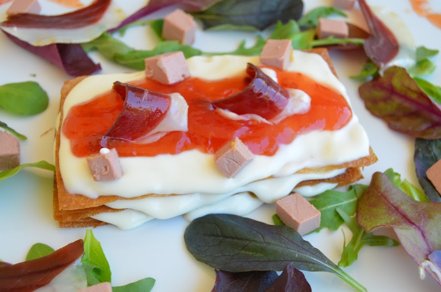 Y sólo queda emplatar, vamos untando los rectángulos de masa brick con el queso camembert, colocando una encima de otra, así hasta tres, en la última ponemos encima del queso camembert la mermelada de tomate, añadimos alrededor los brotes tiernos y decoramos con trocitos de mousse de foie de pato y el jamón de pato, tal cual vemos en la fotografía.