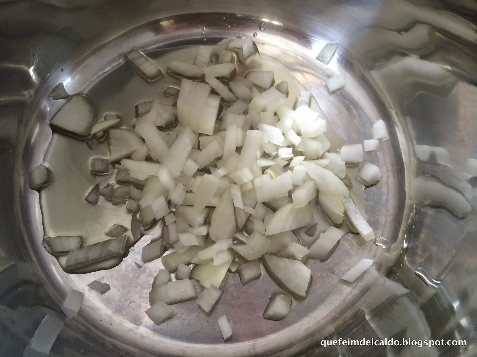 En primer lugar cortamos la cebolleta muy fina, la ponemos a pochar en el fondo de una cazuela con una cucharada sopera de aceite de oliva.