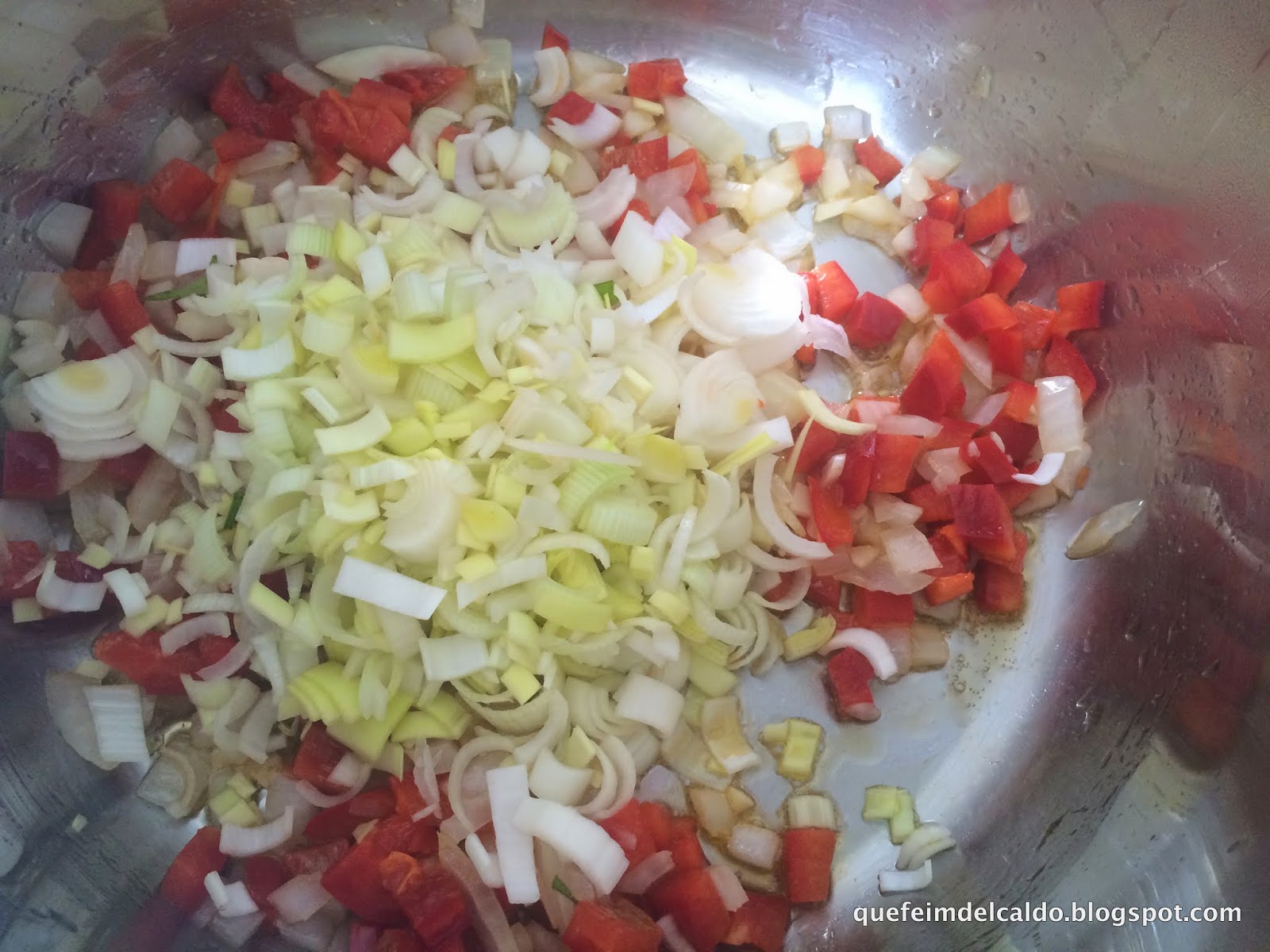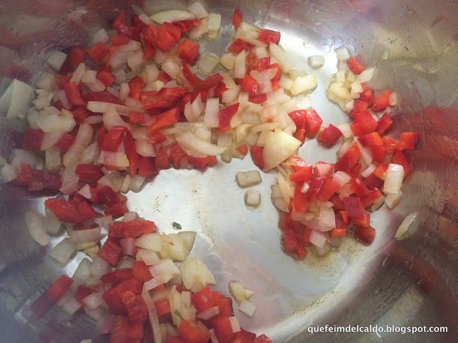 Despepitamos el pimiento rojo y lo cortamos igual de fino que la cebolleta, lo añadimos a la cazuela.