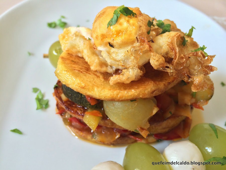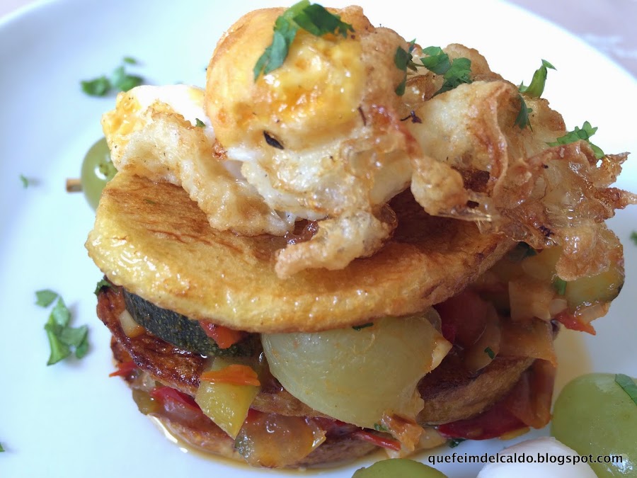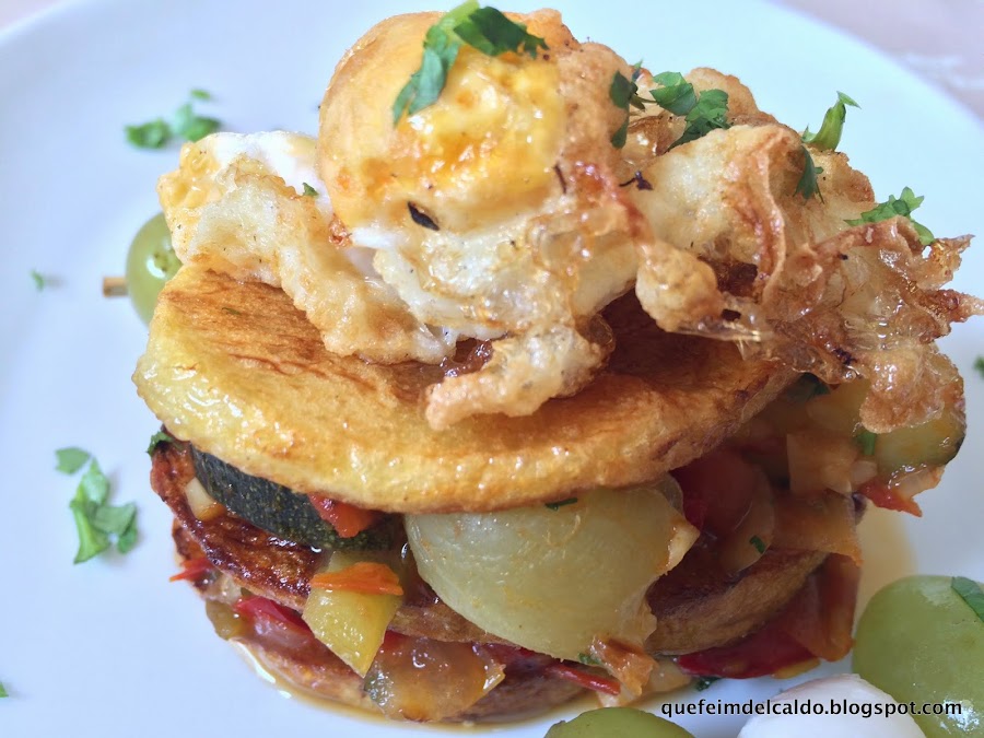 Nos disponemos a emplatar, ponemos en una fuente una rodaja de patatas, sobre ella la ratatouille, volvemos con otra de patatas, otra de ratatouille y acabamos con una de patata.