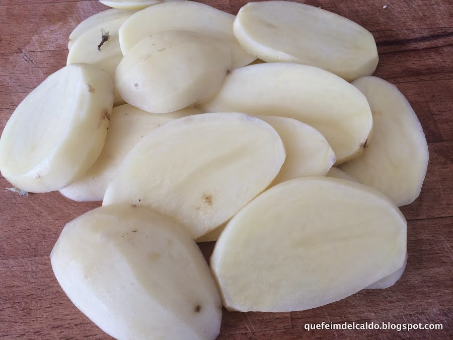 Pelamos la patata, la cortamos en rodajas de aproximadamente de 0,5 mm. las ponemos en un bol y salpimentamos.