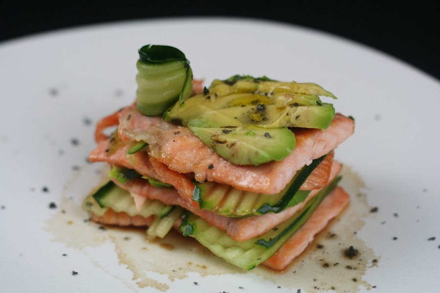Ponemos en primer lugar una base de aliño de la ensalada, sobre ésta una lámina de salmón, encima unas láminas de pepino, ponemos una capa de salmón y sobre esta el aguacate, repetimos la operación hasta terminar la milhoja y decoramos con aguacate y pepino. Salpimientamos con escamas de sal negra y regamos con un chorrito de aceite de oliva.