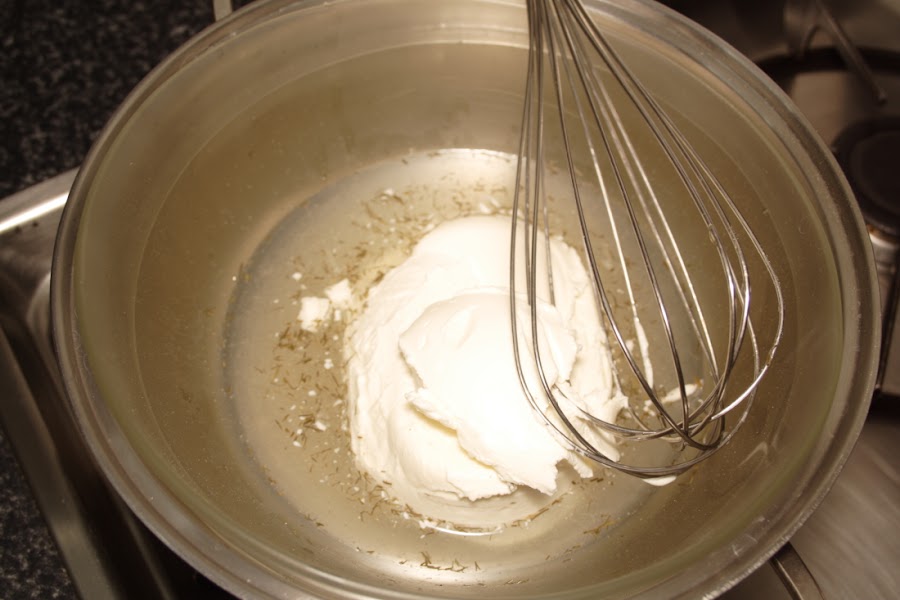 Ponemos a calentar a baño María otro bol con los 70 gr de agua, el zumo de limón, el eneldo y la pimienta. Cuando veamos que empieza a calentarse, sin hervir, añadimos la gelatina hidratada bien escurrida, y batimos enérgicamente con unas varillas ( las eléctricas salpican un poco), hasta que se mezcle todo bien. Echamos el queso, seguimos batiendo bien, hasta conseguir una mezcla completamente homogénea.
