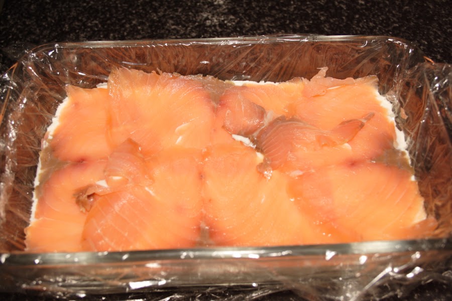 Empezamos a montar el milhojas en el molde forrado de film, primero una capa de salmón, seguida de otra de crema, que extenderemos bien y de forma homogénea. Seguimos con otra de salmón, otra de crema para rematar con una de salmón.