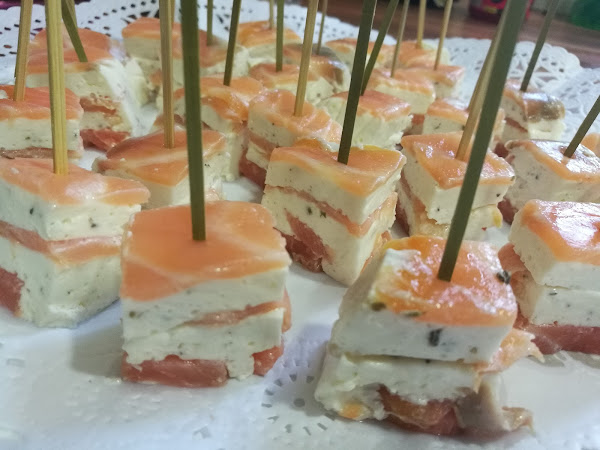 - Volcamos la mitad de la mezcla de queso, y ponemos otra capa de salmón, repetimos capa de queso y acabamos con salmón.