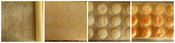 Espolvoreamos con azúcar glas el papel vegetal de la lámina de hojaldre, desenrollamos la misma sobre éste y estiramos con rodillo (palo de amasar). Cortamos círculos con un cortante de 8 cm. de diámetro, salen 12 en total. Espolvoreamos con azúcar glas, los ponemos sobre una bandeja para horno y llevamos a la nevera durante 30 minutos.
