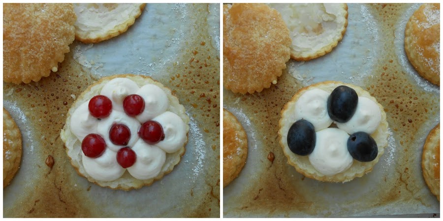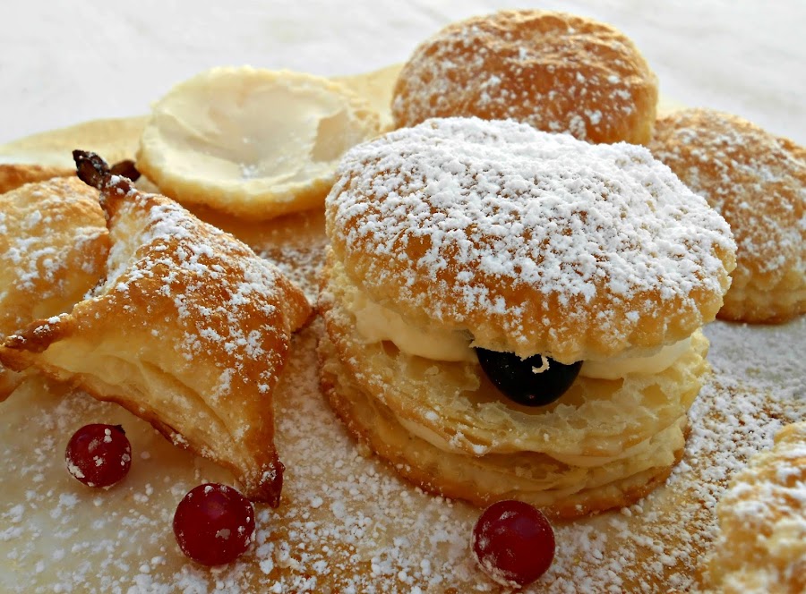 Tomamos un disco de hojaldre, le añadimos crema y colocamos grosellas. Cubrimos con otro disco de hojaldre y ponemos más crema y uvas. Por último tapamos con un disco de hojaldre.