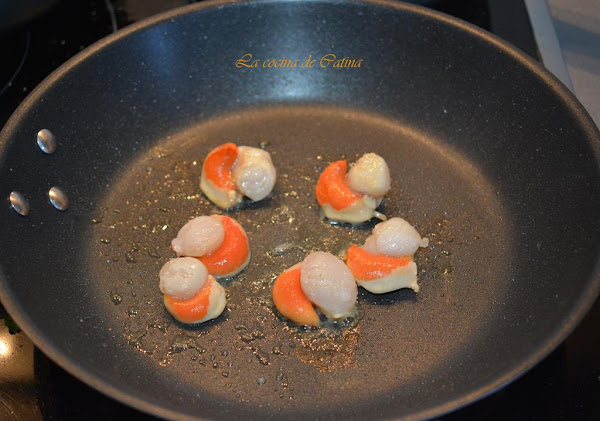 En otra sartén salteamos también con dos cucharadas de aceite las zamburiñas, las salpimentamos y las reservamos.