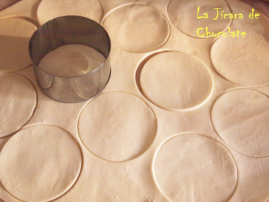 3. Extendemos el hojaldre y lo cortamos según la forma que le queramos dar a las milhojas. En este caso, yo las he hecho redondas, cortando la masa con un cortapastas redondo.