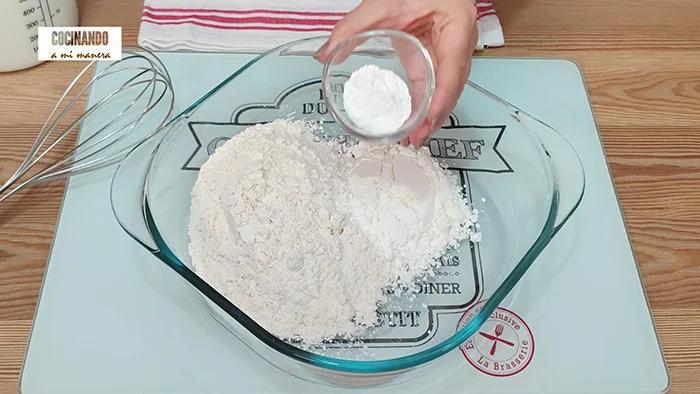 3 Con la mezcla en este punto incorporaremos al bol el aroma de vainilla, las harinas y la leche. Para evitar que se formen grumos y para que no se nos baje la mezcla que hemos trabajado, lo mejor es ir agregando unas cucharadas de harina, alternar un poco de leche, e integrar los ingredientes con movimientos ligeros y envolventes. Ponemos de nuevo harina, leche,.. y así hasta terminar con las harinas y haber añadido 750 ml de leche en total.