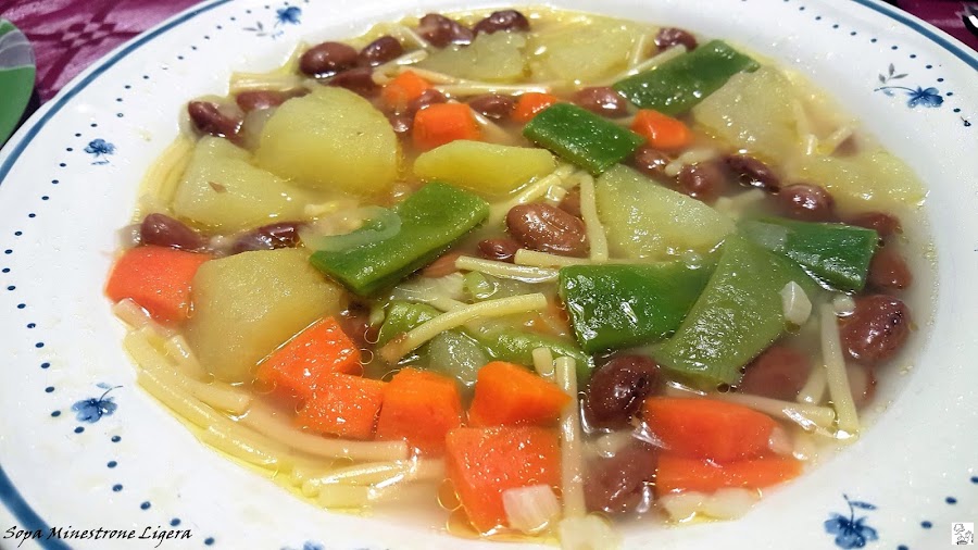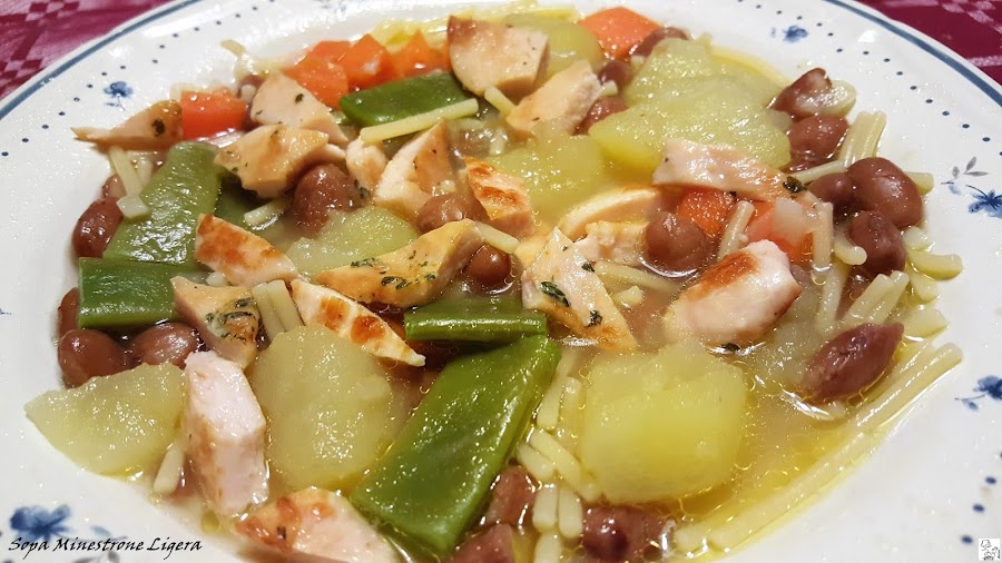 Es un plato de cuchara ligero y saludable y aunque sea principalmente una sopa de verduras, le damos nuestro toque con una pechuga de pollo a la plancha y alubias rojas cocidas.
