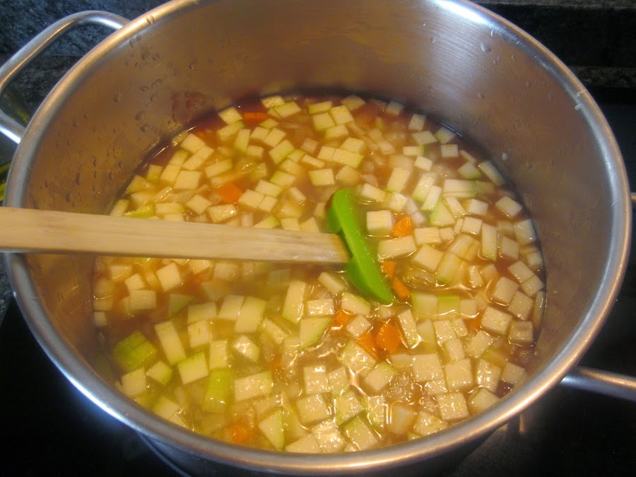 Añadimos el caldo y el agua, las verduras cortadas en cuadraditos, apio,zanahoria y calabacin, el tomate y cocemos durante 35 minutos.