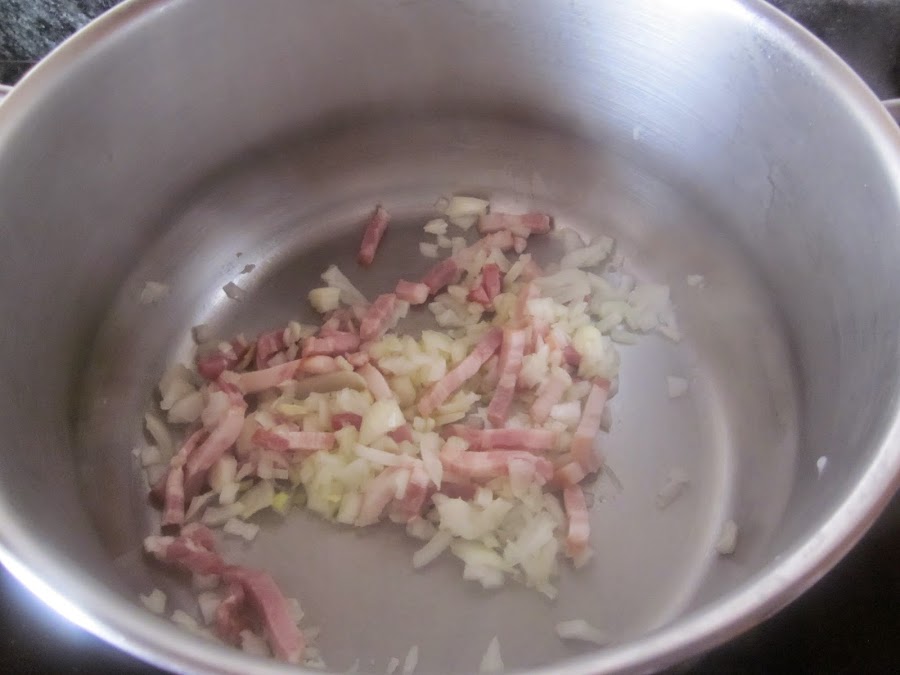 Ponemos tres cucharadas de aceite y sofreímos la cebolla y el ajo picado, junto con el baicon.