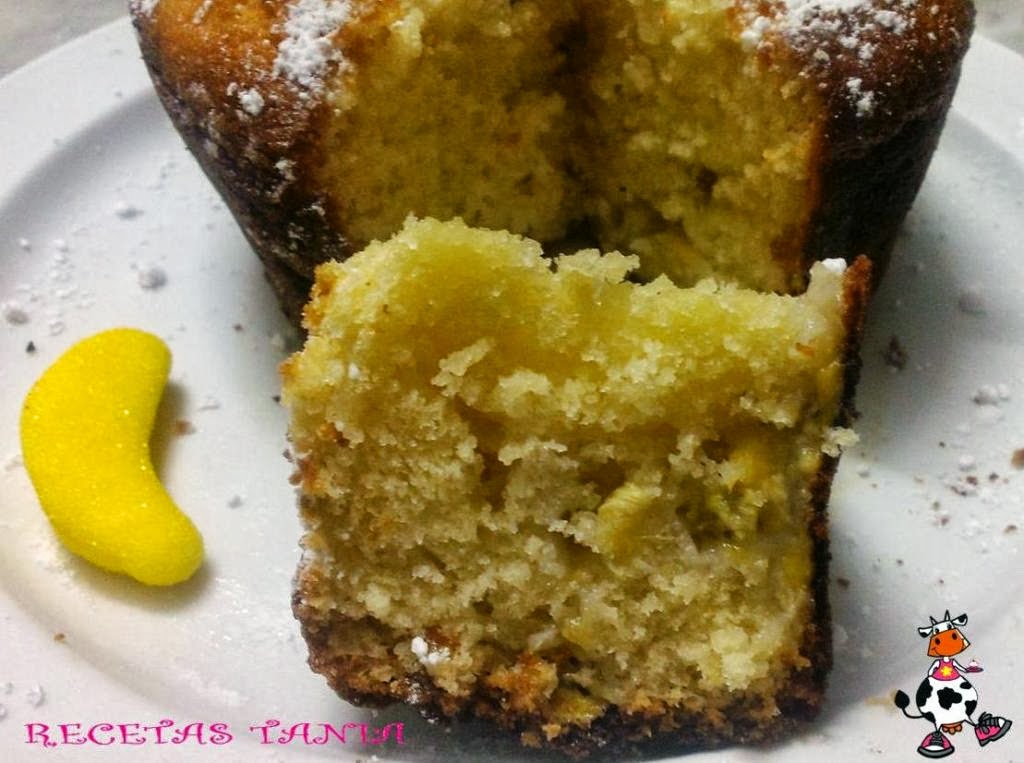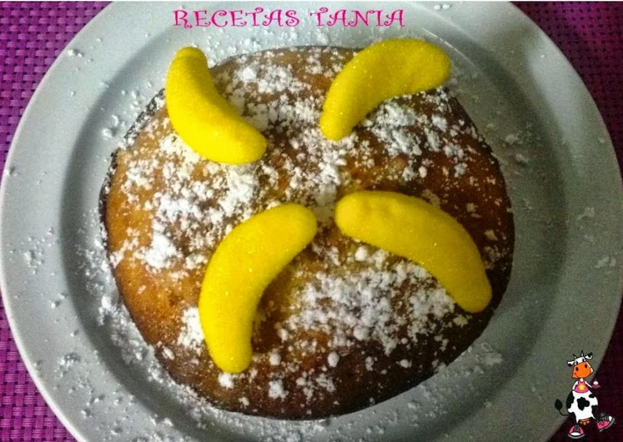 Removemos bien con una cuchara y metemos toda la mezcla en un molde previamente engrasado. Metemos el molde en el horno a 200º unos 35min,para saber si está terminado pinchamos con un palillo,si sale limpio es que está terminado. Desmoldamos y dejamos enfriar un poco,espolvoreamos azúcar glas y colocamos encima unos plátanos de chuches (golosinas). Y a disfrutar...está riquísimo!! :D
