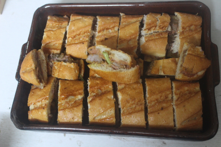 Troceamos en mini bocadillos de dos o tres dedos de longitud cada bocadillo y colocamos ambos bocadillos mezclados en una fuente o bandeja.