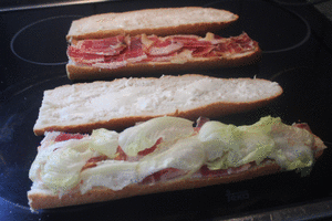 Preparamos dos bocadillos, uno de jamón salado cubriendo el jamón con hojas de lechuga y el otro, sin lechuga.