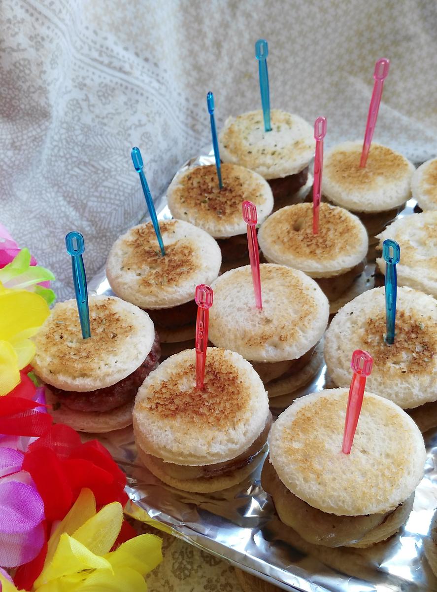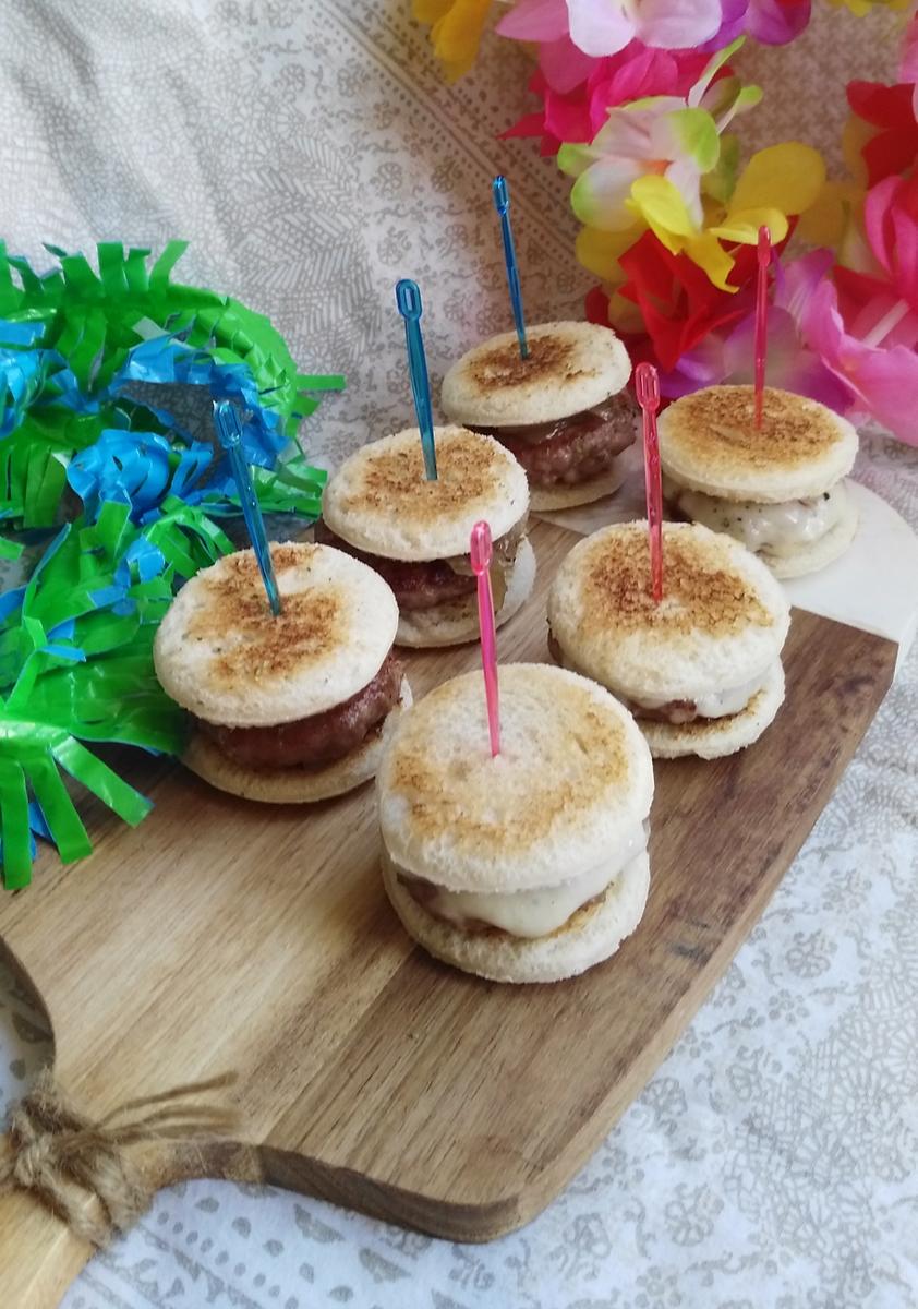 Y así quedan montados los mini bocadillos de hamburguesas con cebolla caramelizada y queso.