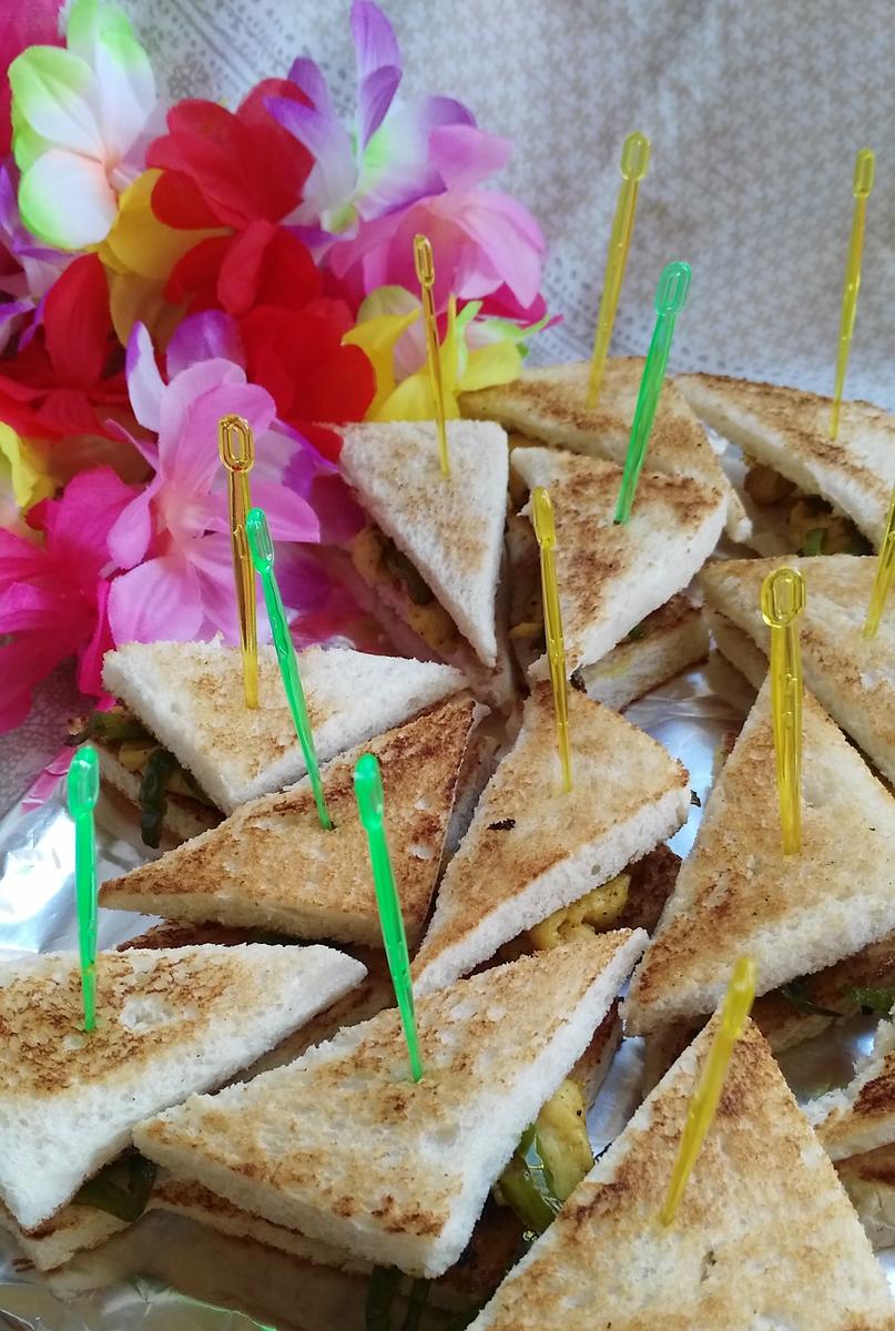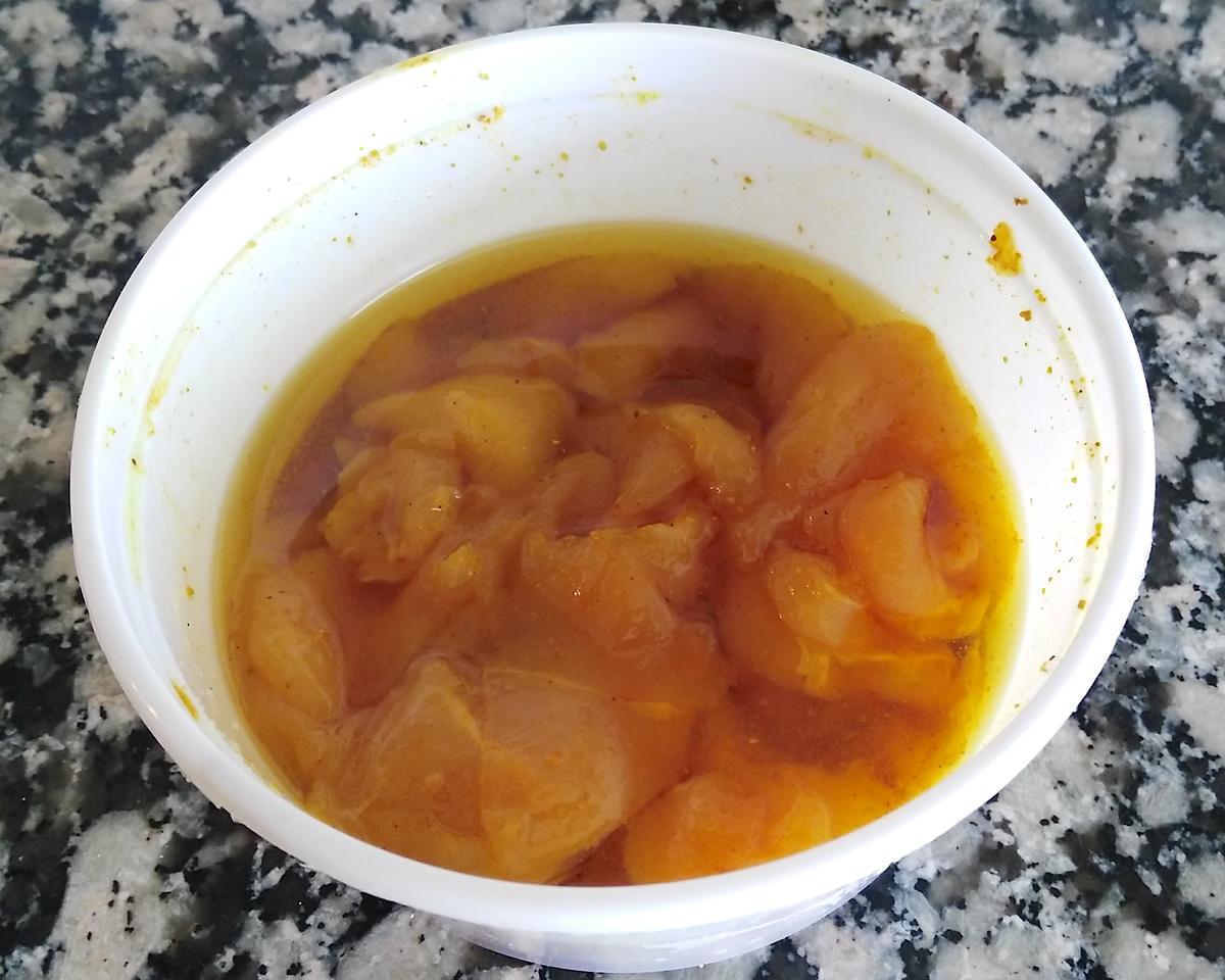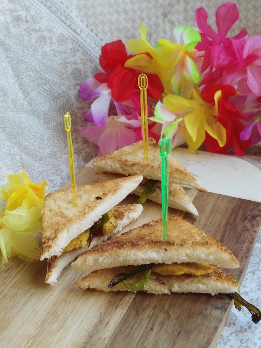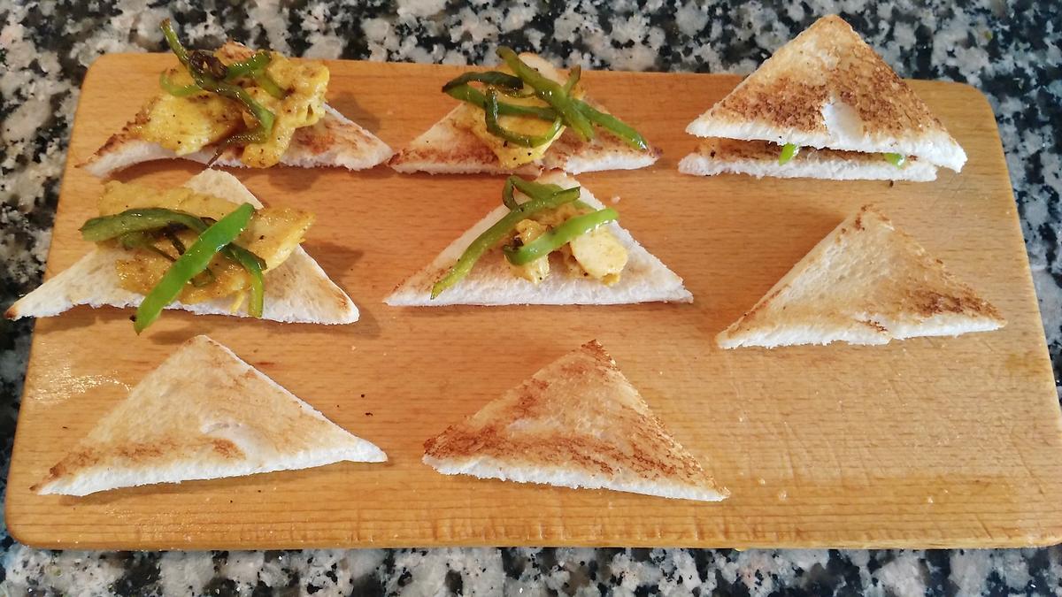 Mini sándwich de pollo al curry // Un día antes, lamina la pechuga de pollo en trozos no muy grandes y salamos. Deshacemos una cucharadita de postre de curry en unos 50 cl de aceite y ponemos a macerar el pollo. Guardamos en el frigorífico hasta hacerlos servir.