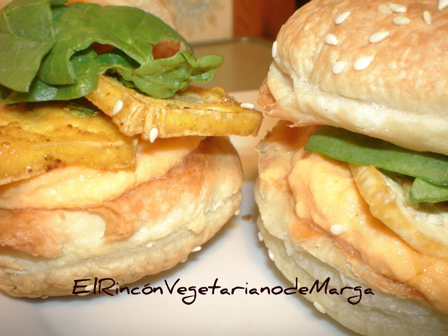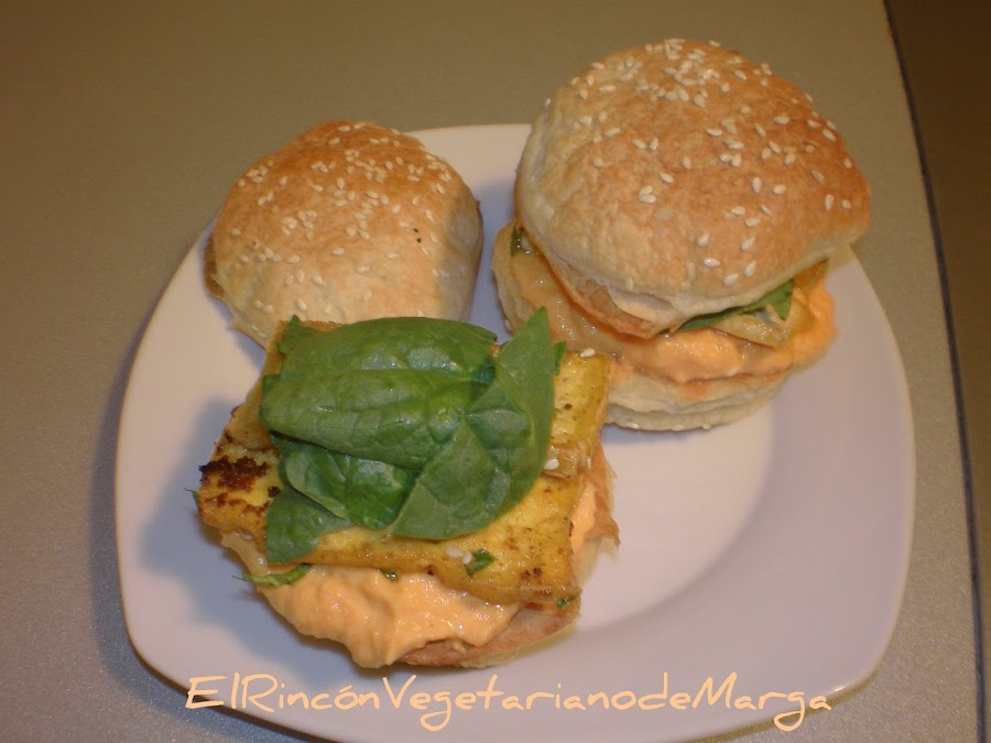 Untamos con paté de zanahoria nuestros bocaditos, encima le ponemos el tofu al curry y por último unas hojas de espinacas frescas, los tapamos y... tenemos unos bocaditos deliciosos!