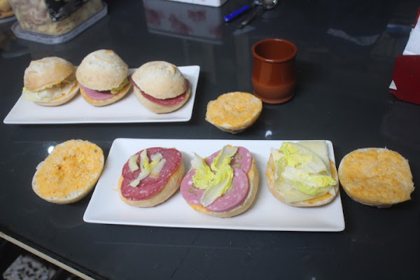Continuamos trabajando poco para realizar la cena en casa, pero preparando unos mini bocadillos variados, se puede cenar bien y además, gastamos restos de embutidos perdidos en la nevera.
