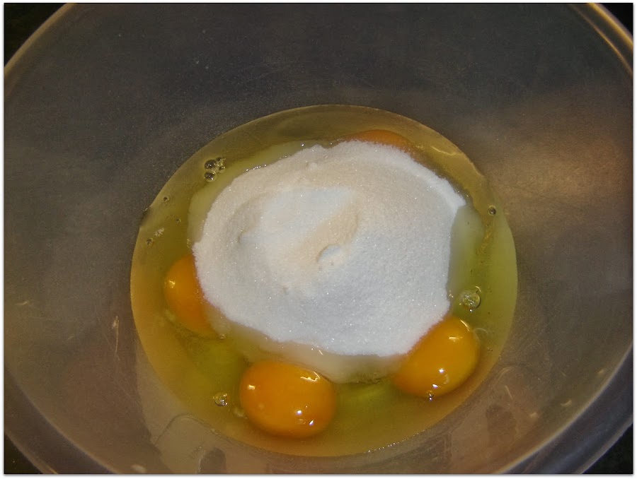 En primer lugar disponemos de los ingredientes y comenzamos batiendo los huevos con el azúcar hasta que espumee. Precalentamos el horno a 200 grados.