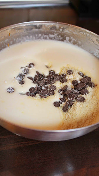 5. Incorporamos las almendras molidas y las gotas de chocolate (las pasamos un poco por harina para que no se hundan al fondo). Removemos con una cuchara de madera.