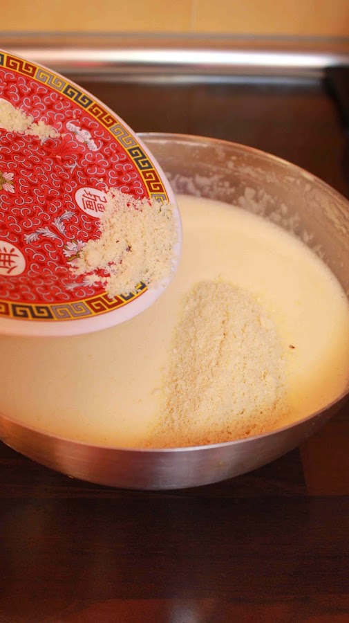 6. Echamos la harina en 3 veces mientras removemos con una cuchara de madera o con una varilla de mano pero sin batir simplemente remover suavemente.