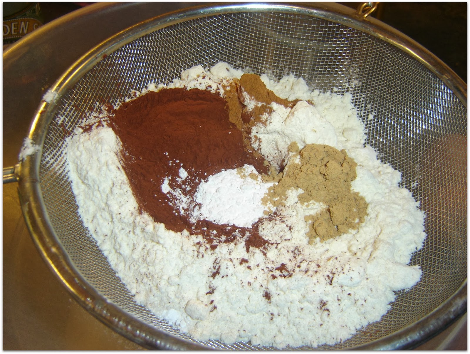 Tamizamos en un bol la harina, la levadura, el jengibre, la canela y el cacao en polvo.