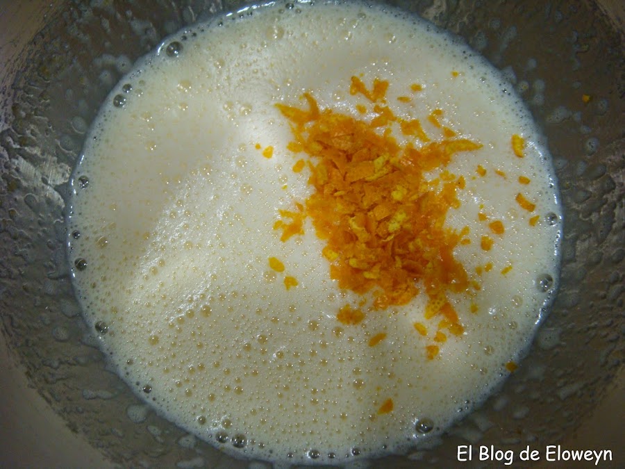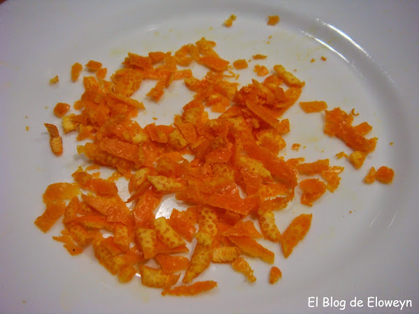 Lavar la naranja bien lavada y rallar su piel con cuidado de que no se cuele ningún trozo de la parte blanca, ya que si se nos cuela un trocito, amargará el postre. Si la ralladura es demasiado grande, cortarla en trocitos con un cuchillo.