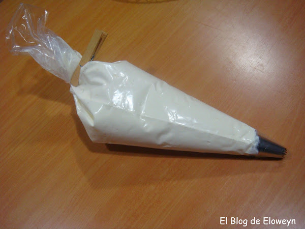 Sacar la manga pastelera de la nevera y rellenar los huecos de los mini bundt cakes.