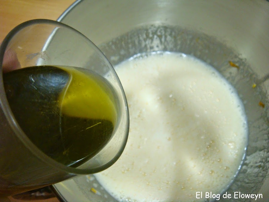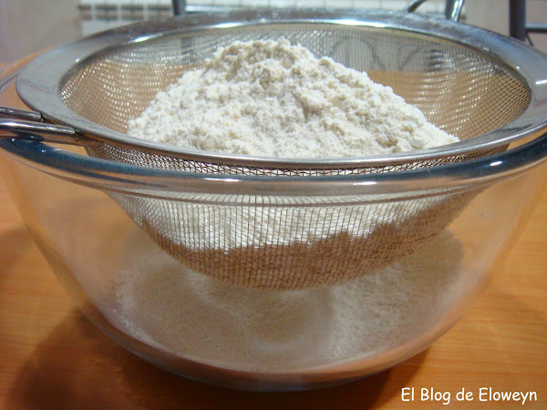 Tamizar la harina con la levadura. Como no tengo tamizador, he usado un colador de malla fina.