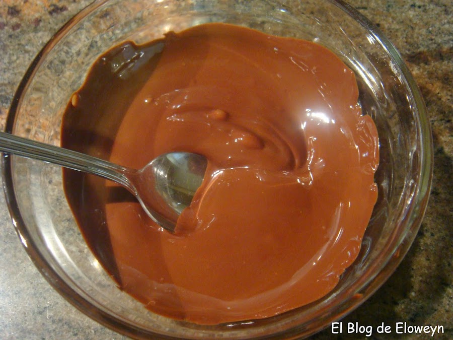 Introducir el recipiente en el microondas y programar 2 minutos en la opción de descongelar. Una vez hayan pasado los dos minutos, remover con una cuchara hasta que el chocolate se haya derretido completamente.