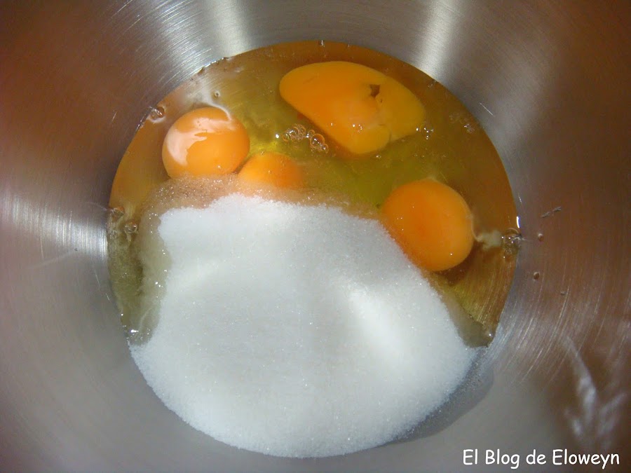 A continuación partir los huevos en el recipiente que se usará para hacer la masa. Yo he usado la Kitchenaid, con el accesorio de pala, pero se puede usar cualquier robot con varillas, o hacerlo a mano.