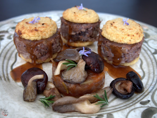 Formar con la carne de rabo de buey, y la ayuda de un molde o cortapastas, pequeños cilindros de diámetro similar a las piezas horneadas con el puré.