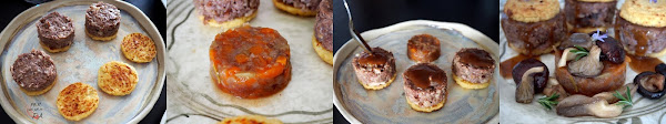 Colocar una pieza de puré en la base y un disco de carne encima, rociar con la salsa y cubrir con el "pan" de puré.