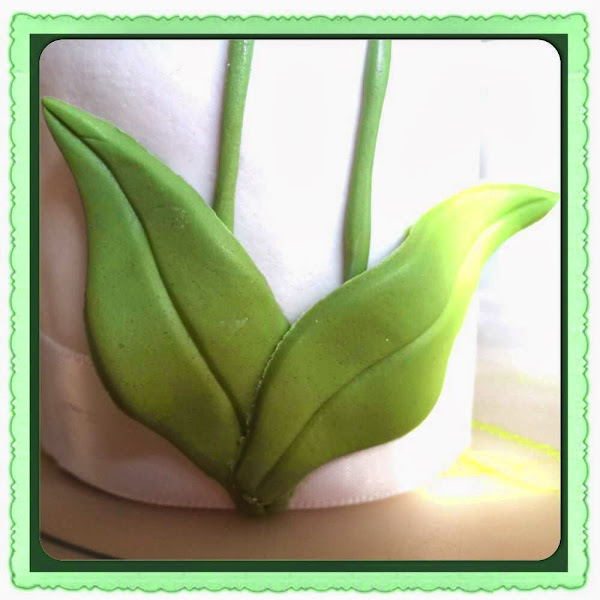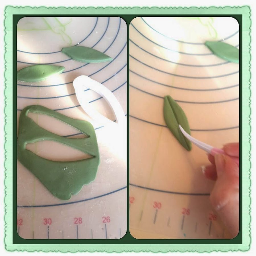 con un cortador de hojas, cortar dos en fondant verde y con la esteca marcar la enebra del medio sin apretar muy fuerte.