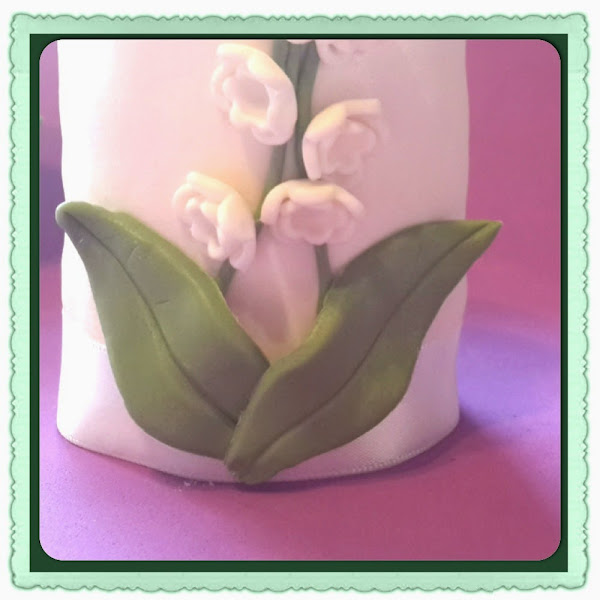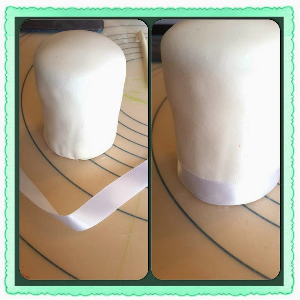 Cuando ya este forrada colocar una cinta blanca en la base del bizcocho. Pegarla con pegamento comestible.