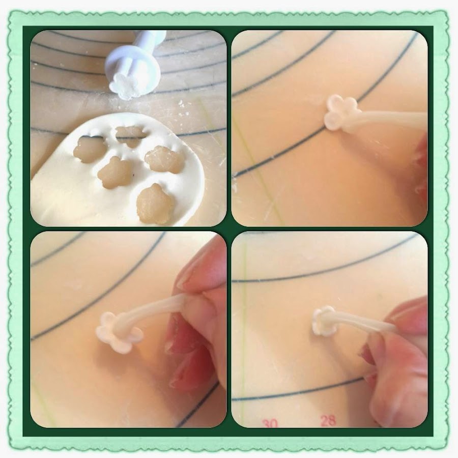 Ahora tocan las florecillas. Las hice pequeñas y de dos tamaños, bolillandolas en el centro para darles forma acampanada.