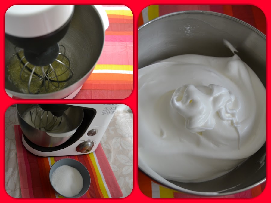 Las ponemos a velocidad media, y con una pizca de sal. Cuando están espumosas le agregamos el azúcar y batimos hasta que esten consistentes y brillosas.