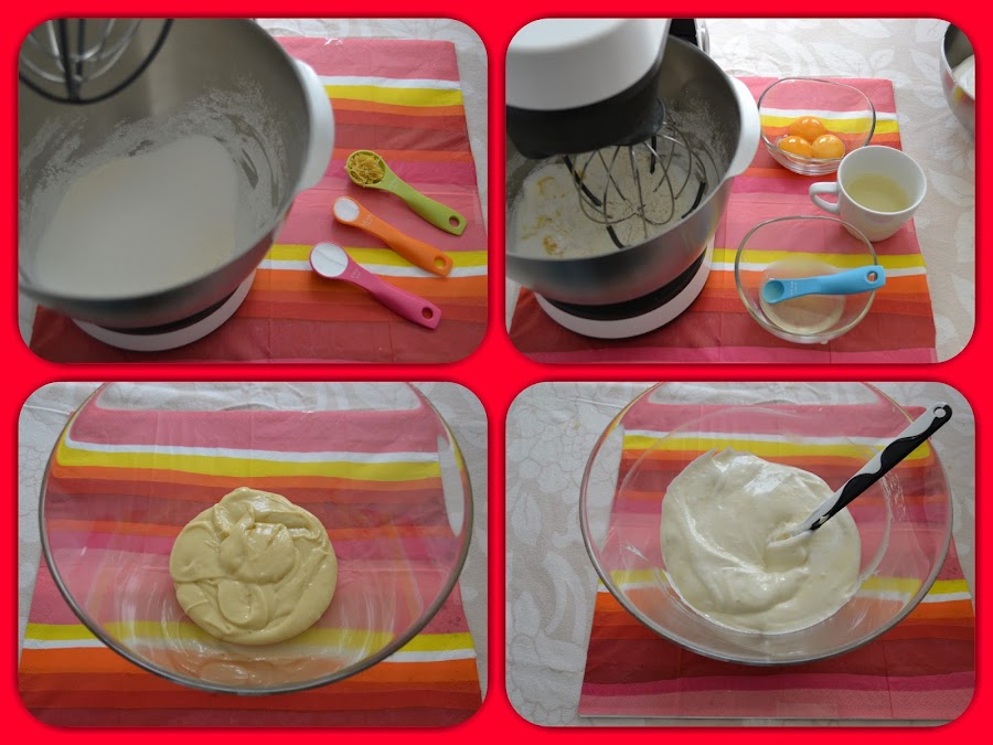 Le agregamos las yemas. Seguimos mezclando, y ahora le agregamos el jugo del citrico que hayan elegido, la ralladura y el aceite. Tenemos que conseguir una crema amarillenta y suave.