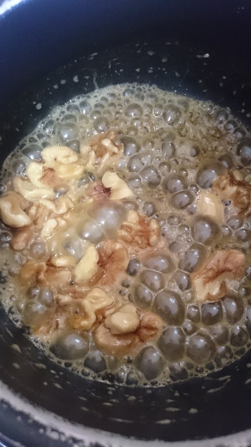 Aprovechamos en ese tiempo para caramelizar nuestras nueces para decorar. En un cazo vertemos la miel con la mantequilla y cuando comience a burbujear añadimos las nueces. Movemos el cazo con movimientos circulares para que se bañen bien nuestras nueces. Retiramos cuando se esté evaporando el caramelo o cuando veamos que tienen un dorado deseado. Dejamos secar en papel de horno. Una vez listo nuestro postre las añadimos! Están bien ricas!