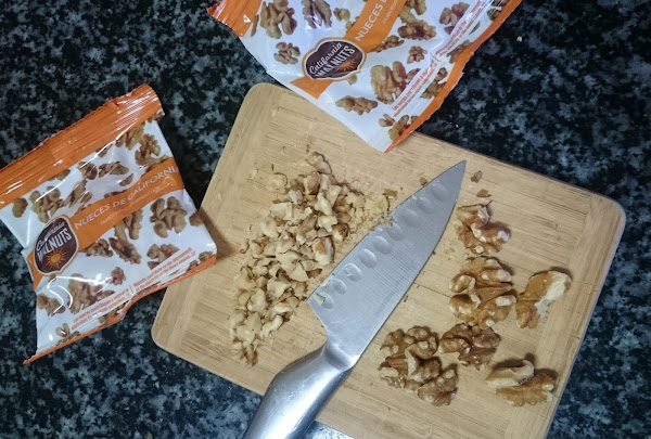 Mientras reposa aprovechamos para poner en remojo las láminas de gelatina en agua fría. Troceamos las nueces y reservamos.