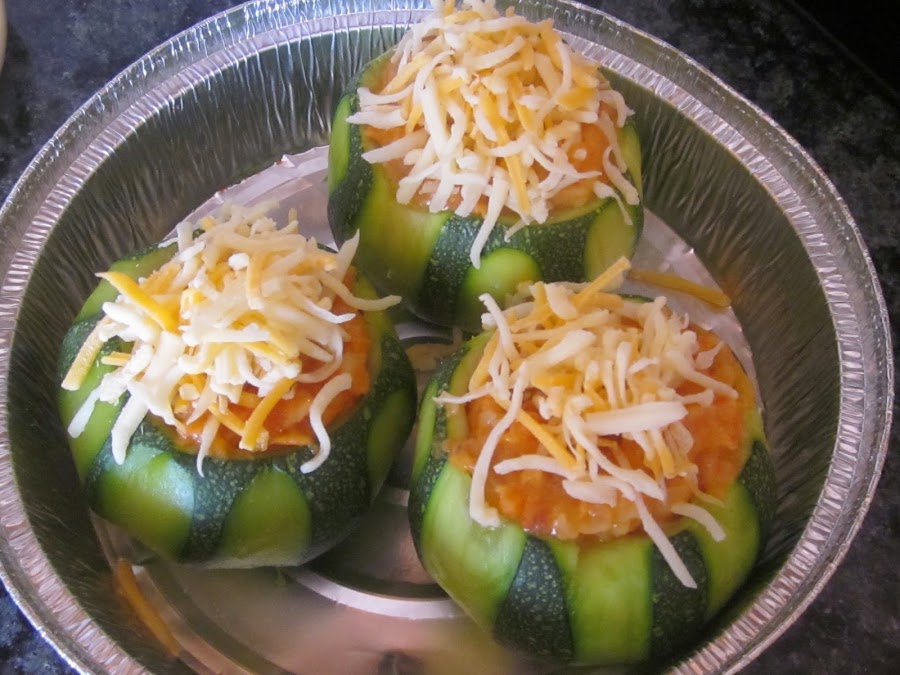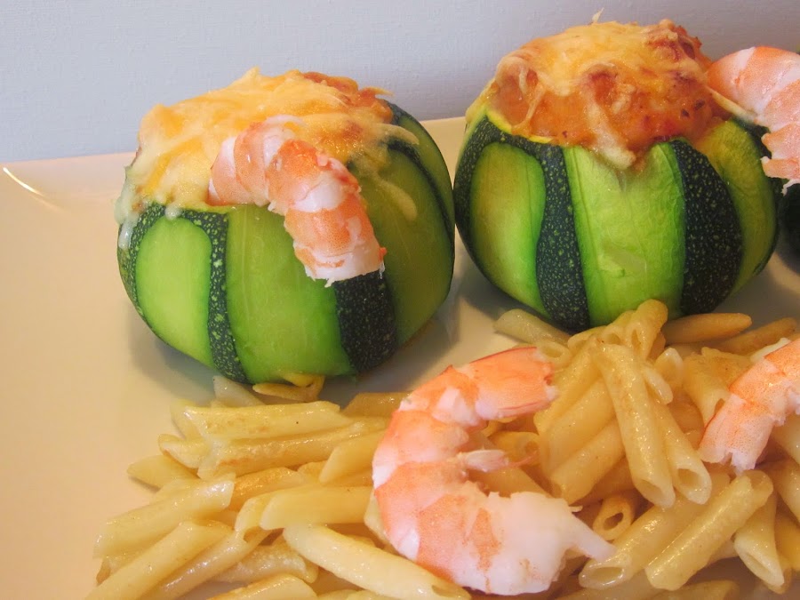 Cuando hay enfriado un poco, rellenamos los calabacines y ponemos queso por encima, gratinamos unos minutos a 200º, adornamos con una gamba y listos para consumir.