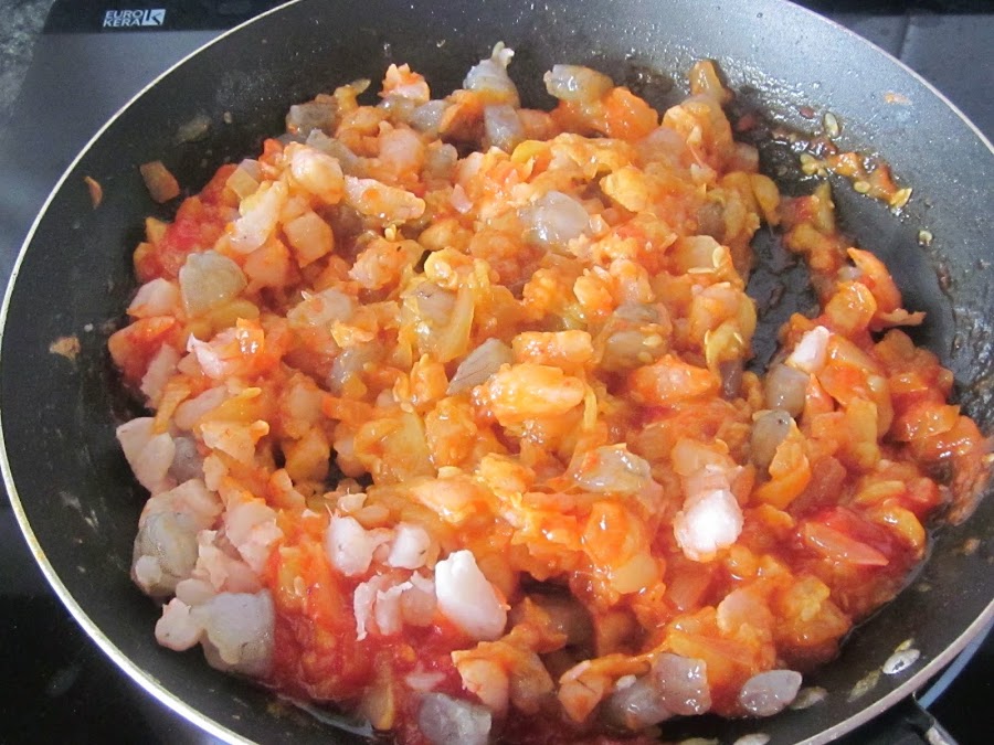 En esta ocasión y como estaba en casa mi hijo que no come carne, le puse un relleno de langostinos, pero podemos poner carne molida, o atún, huevo duro, etc....